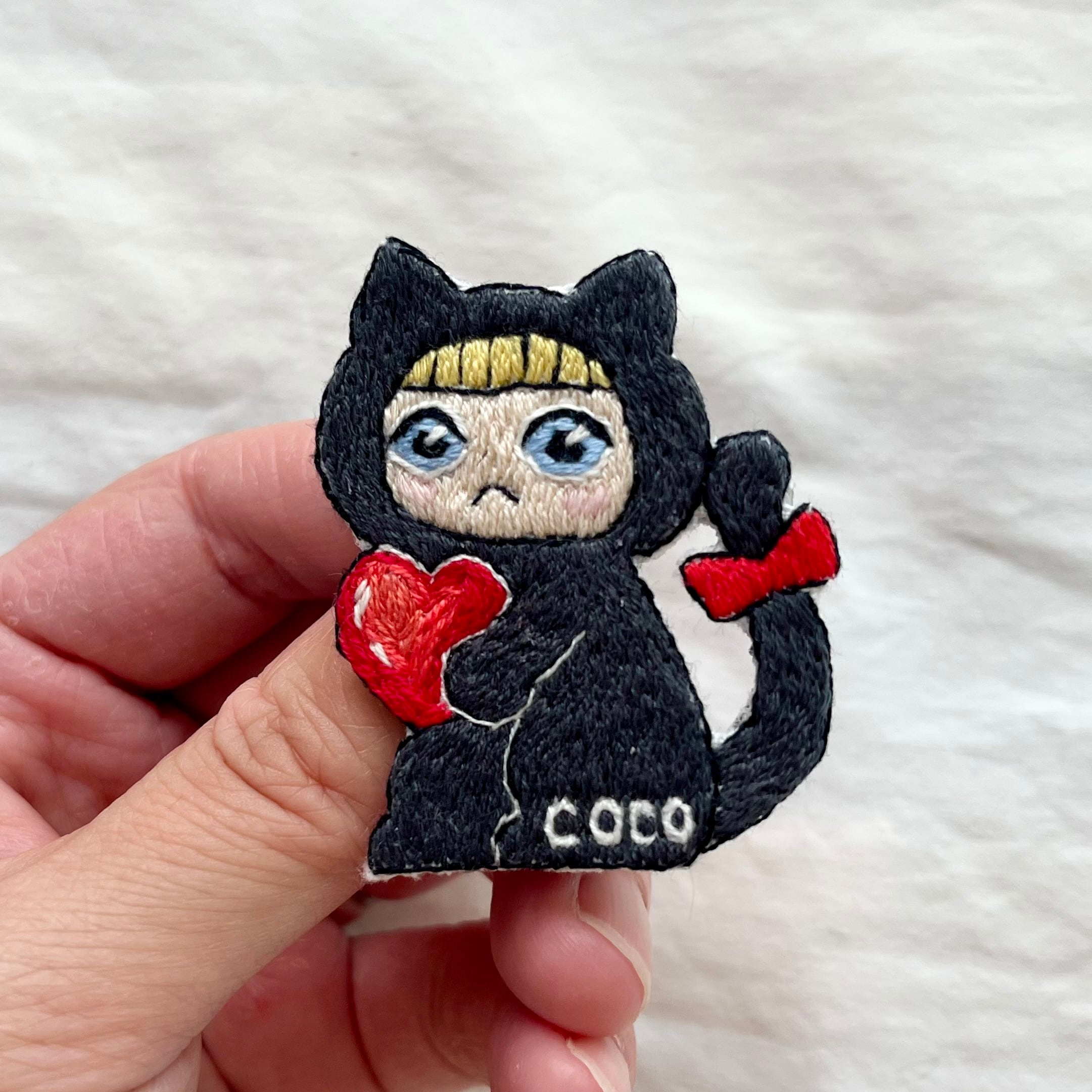 キュートなデザインが特徴のこちらの手刺繍ブローチは、猫になりたい人間の女の子COCOちゃんをデザインした手刺繍ブローチです(*ˊ˘ˋ*)