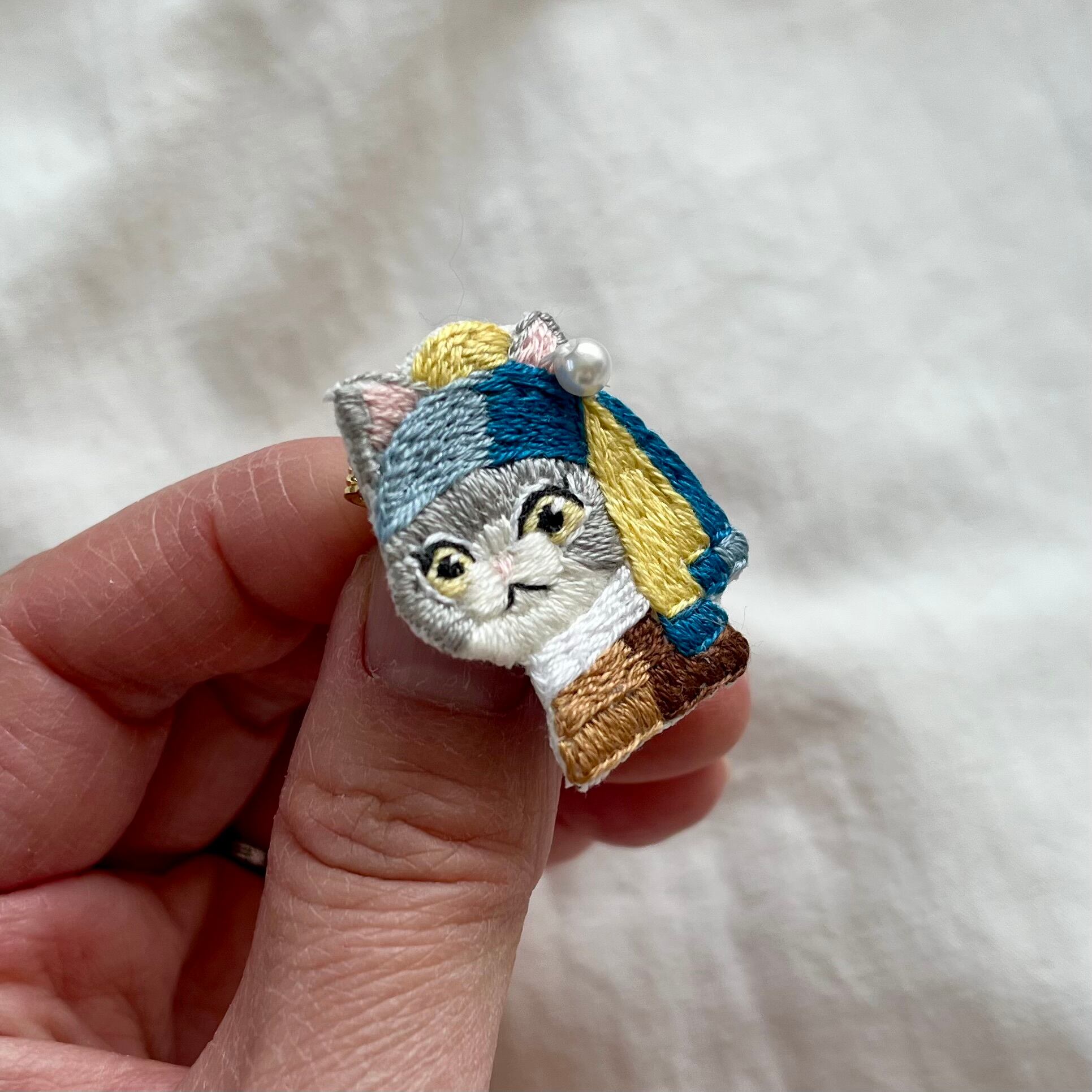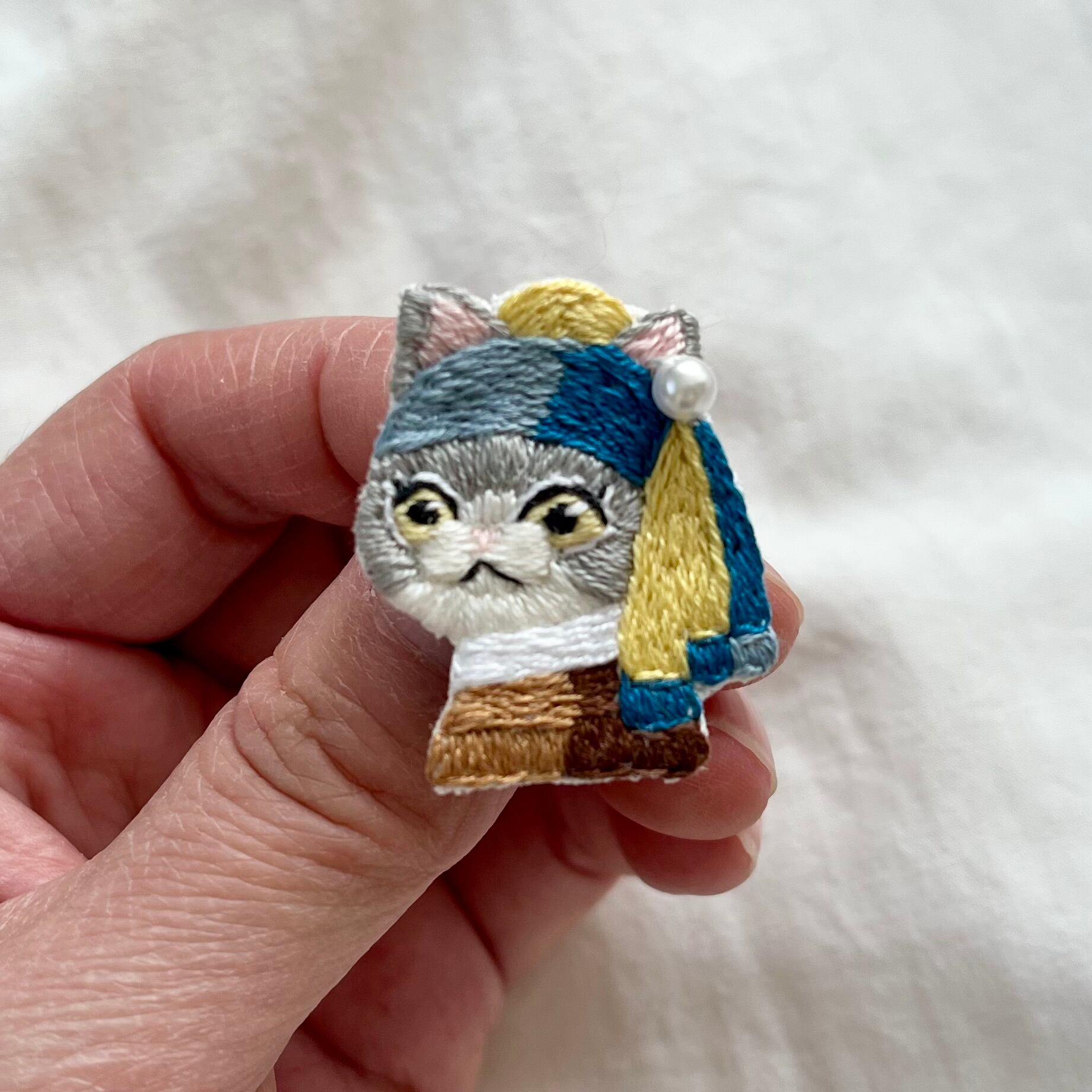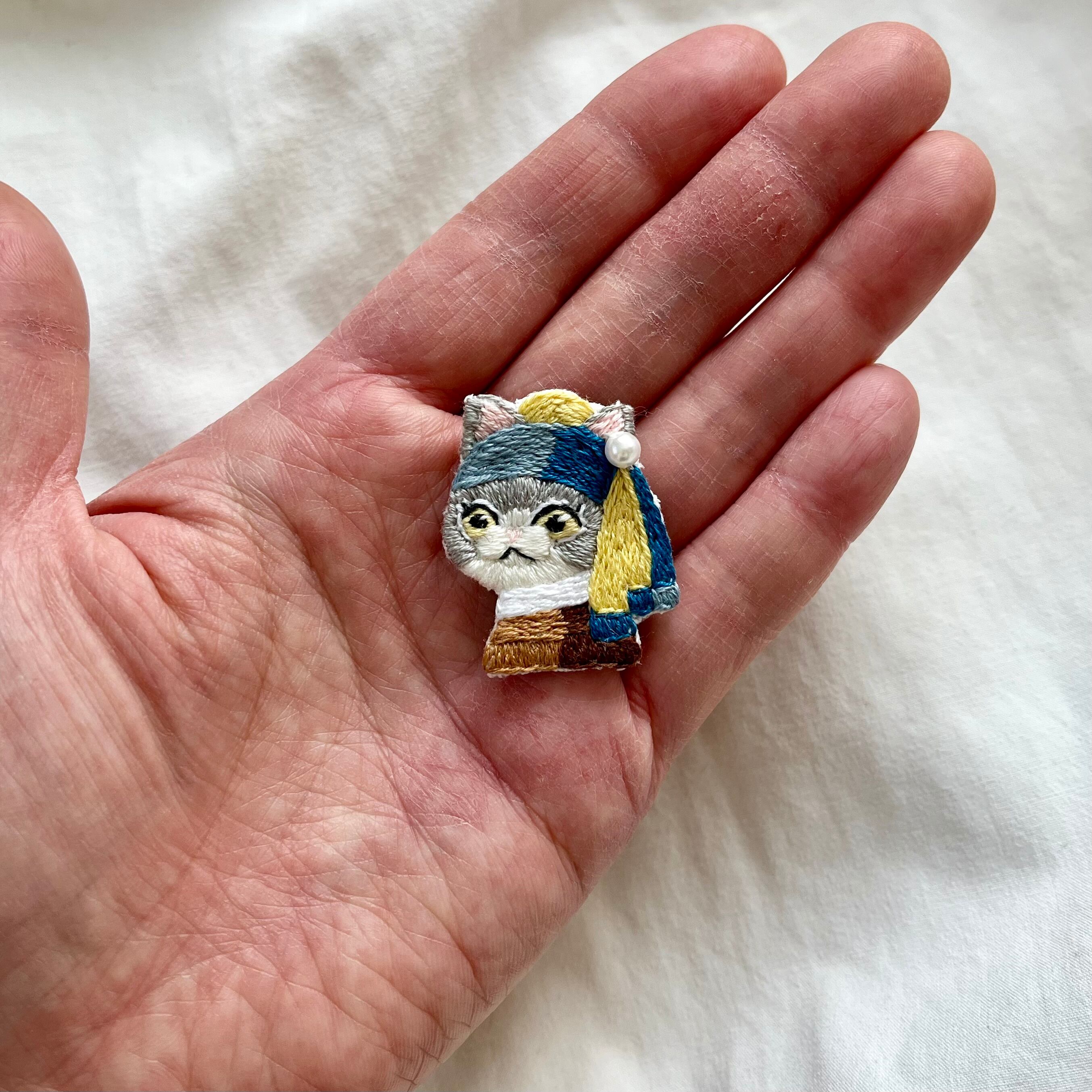 \真珠の耳飾りのニャンコ手刺繍ブローチシリーズ/