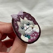 【2023年製作】身支度猫ちゃん手刺繍ブローチ【パープル】