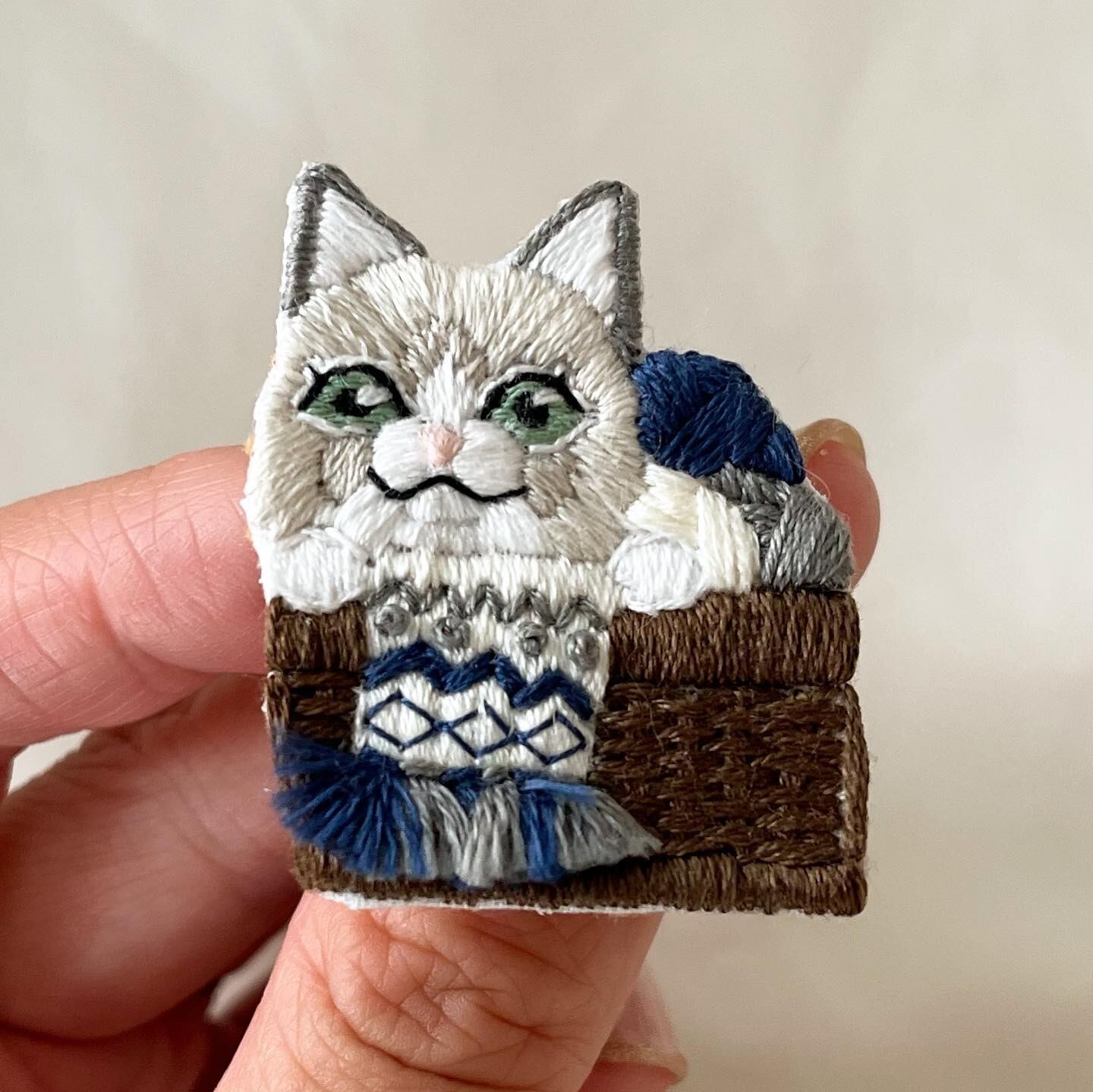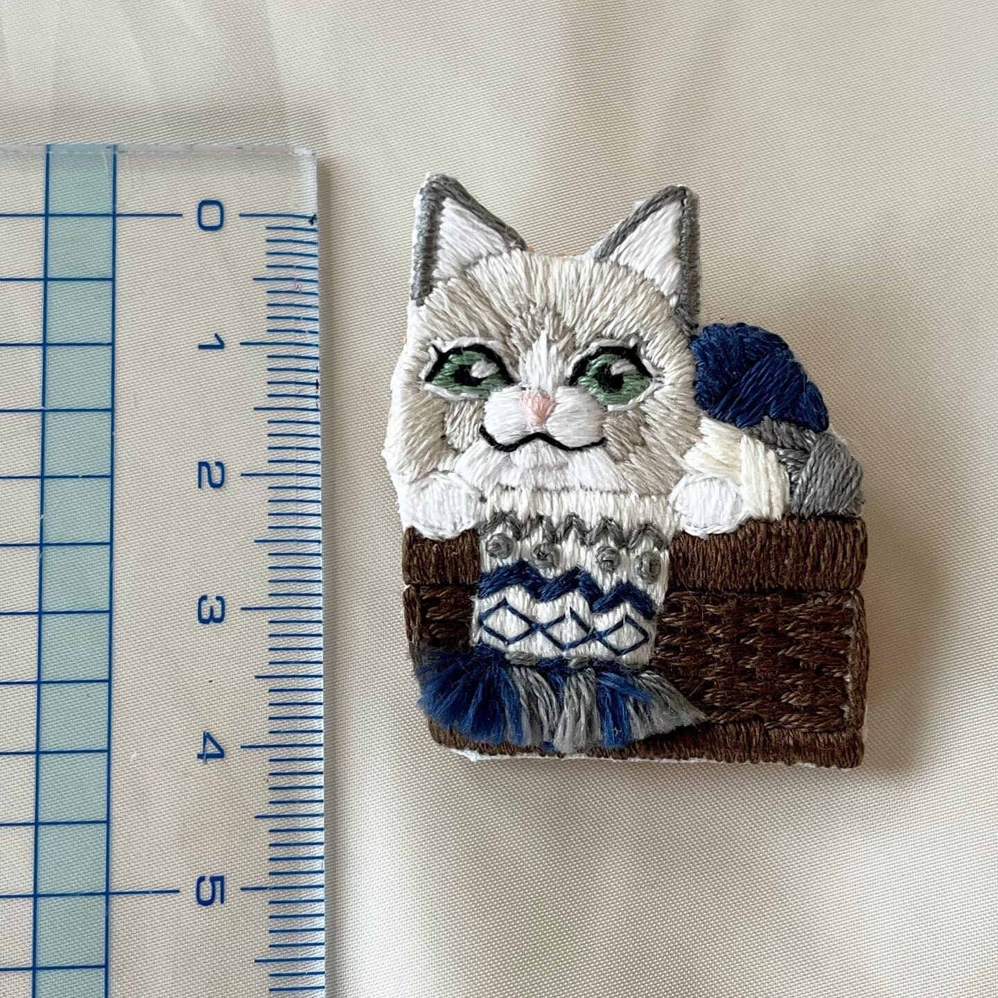 毛糸の籠に入ったマフラー猫ちゃん手刺繍ブローチ(BL)