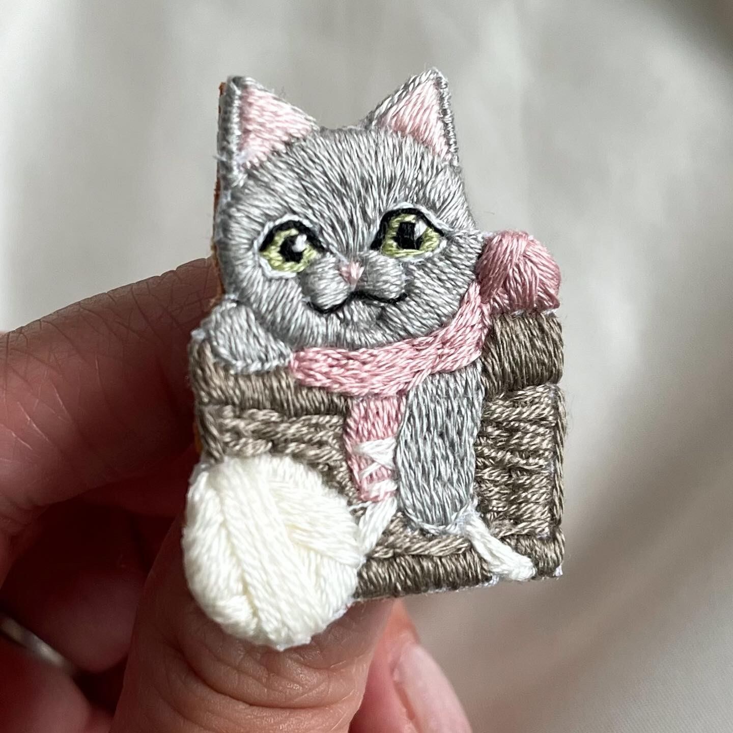 毛糸の籠に入ったマフラー猫ちゃん手刺繍ブローチ