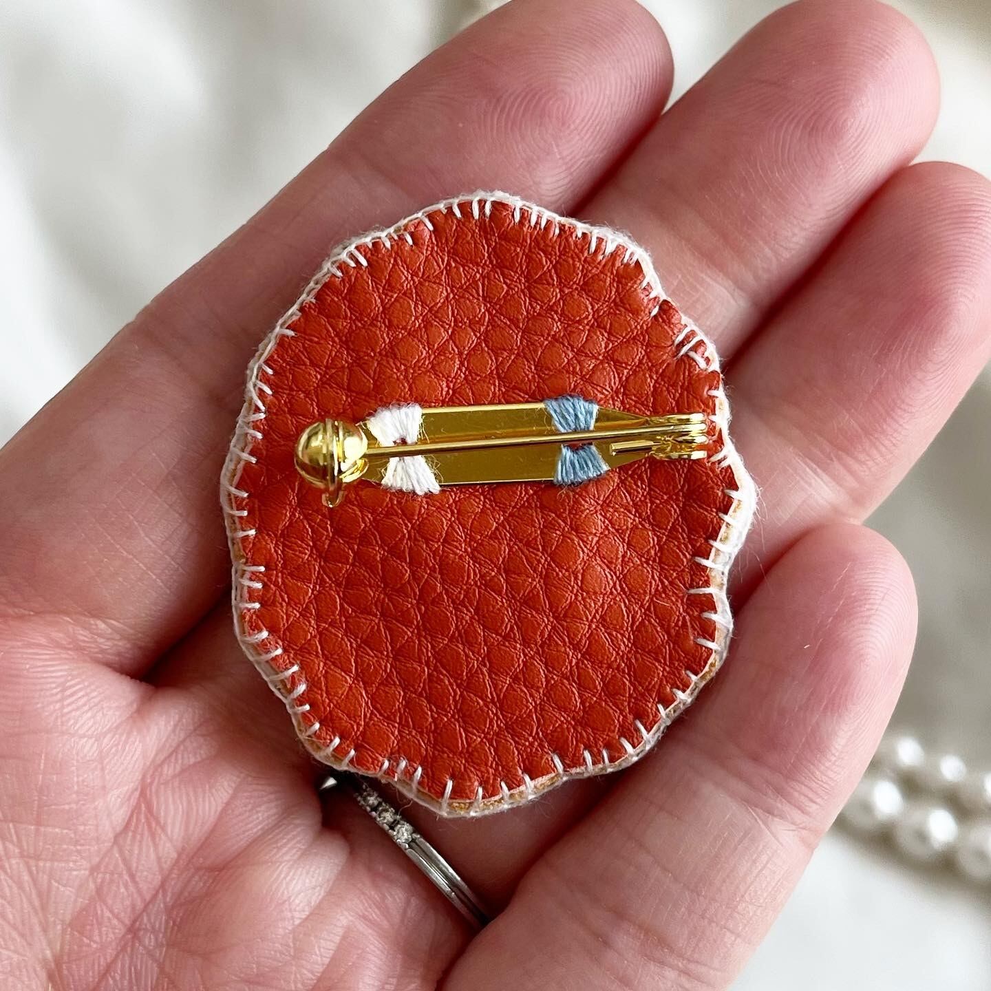 素材⋯COSMO刺繍糸、25mmブローチピン、裏面は接着芯とフェイクレザーを重ねています。