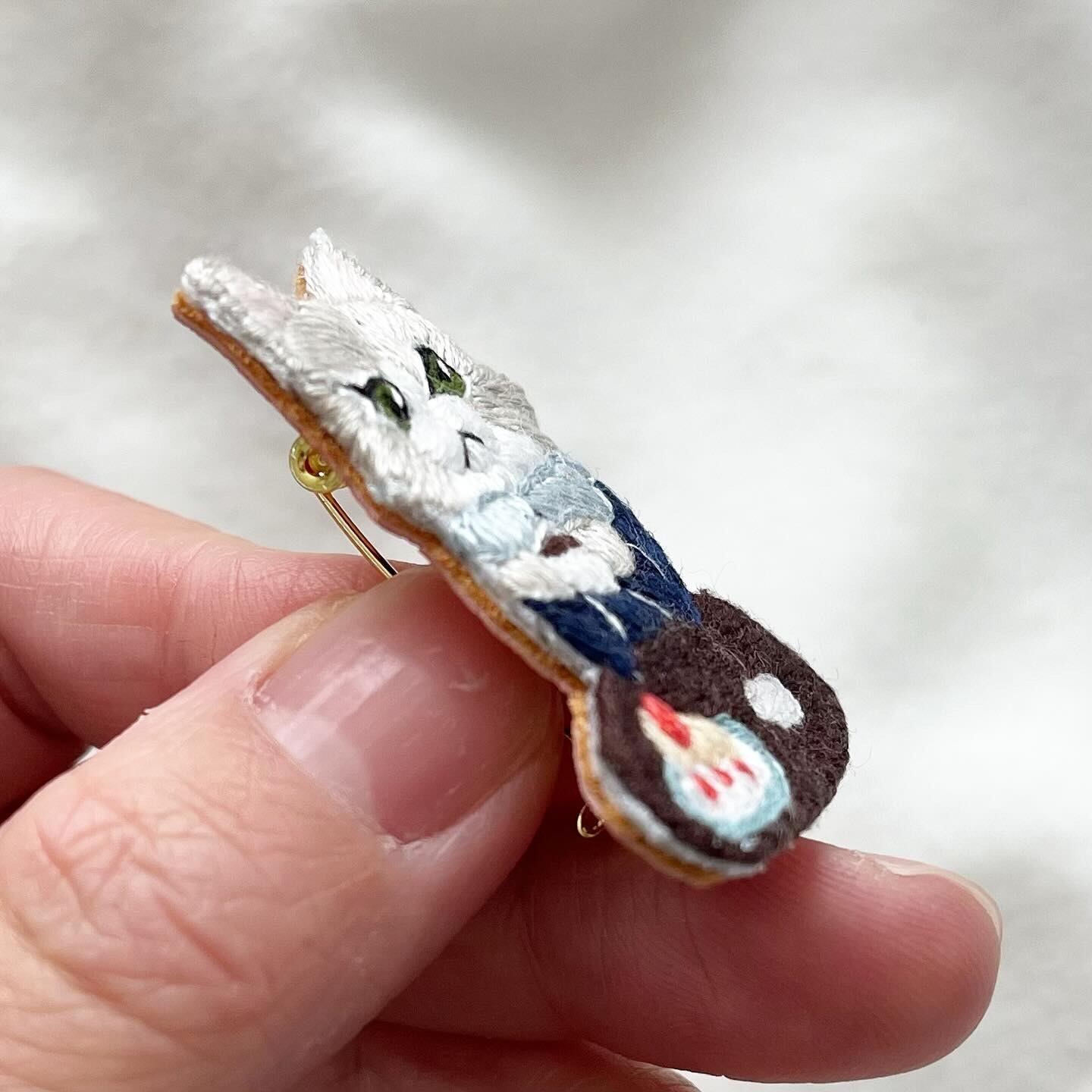 \カフェタイムを楽しむ猫ちゃん手刺繍ブローチシリーズ/