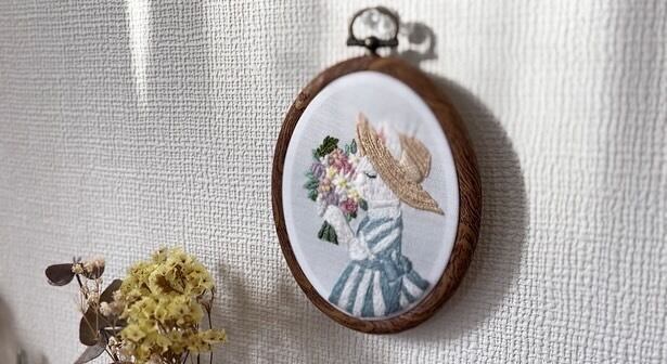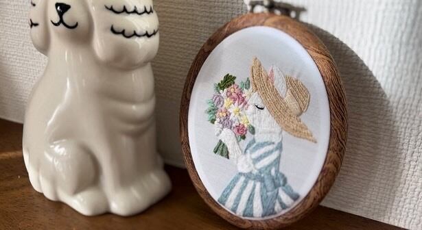 この作品は、春の美しい季節と愛らしい猫がブーケを持っている様子を手刺繍で表現描いております。
