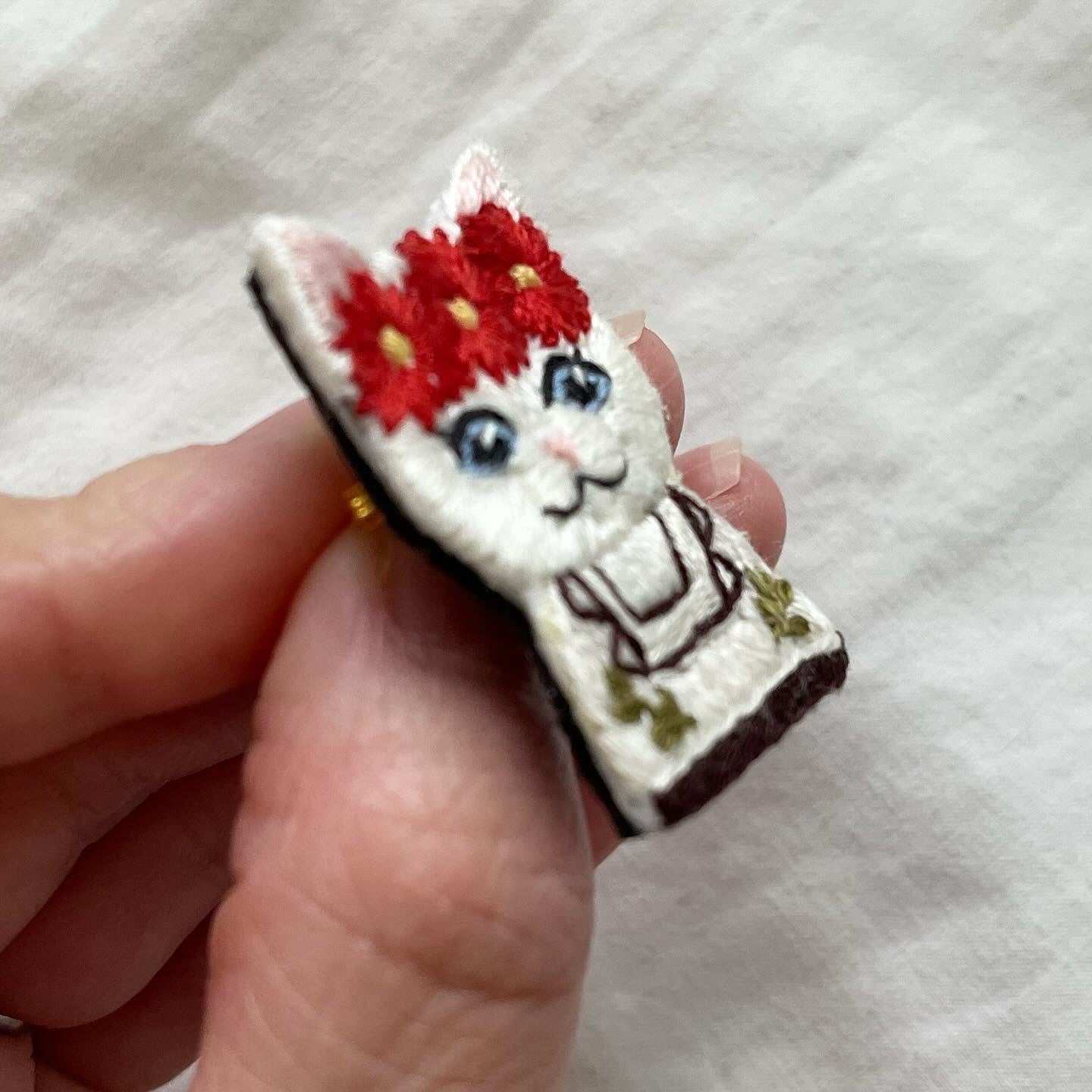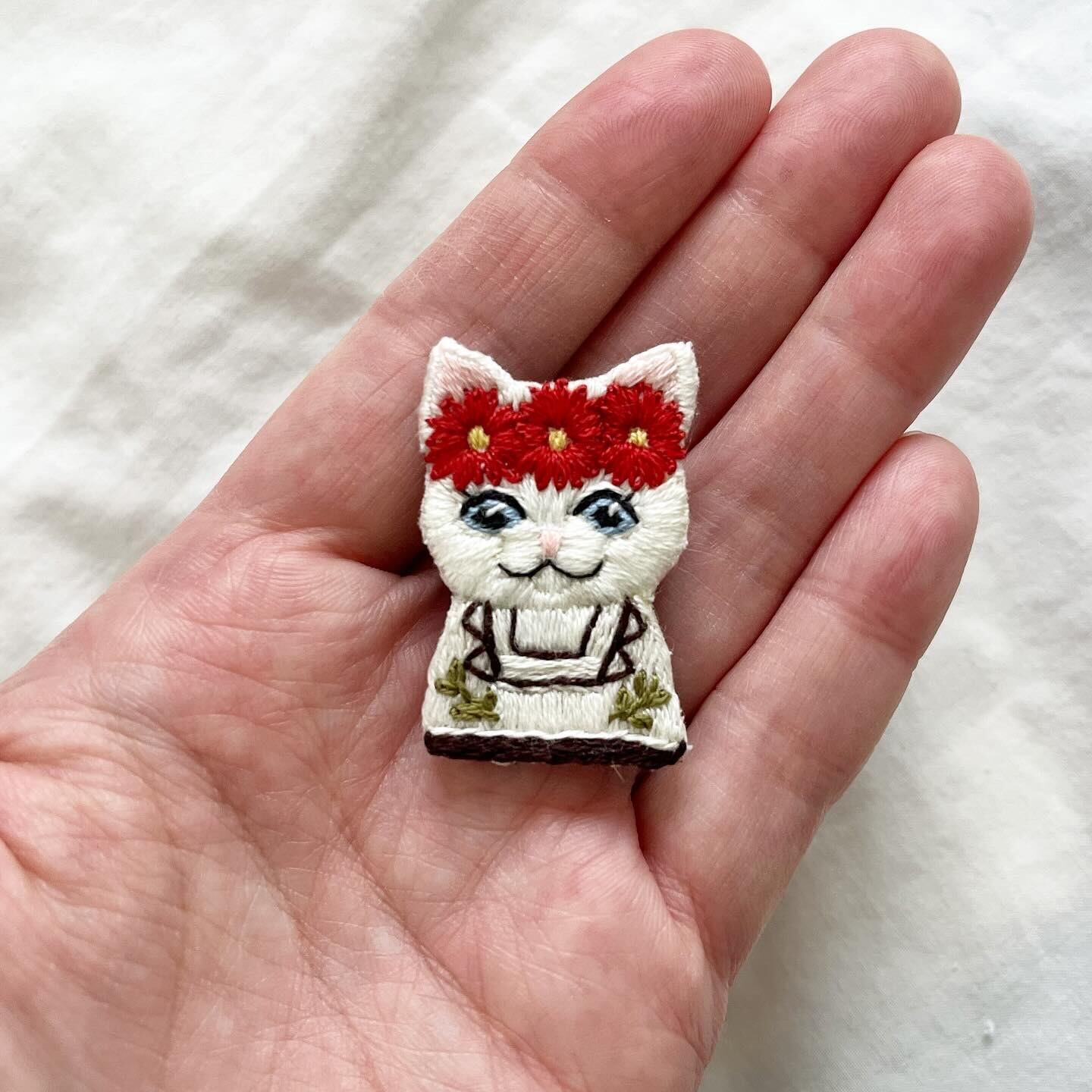 ボタニカルな花冠の猫ちゃん手刺繍ブローチ【RD】
