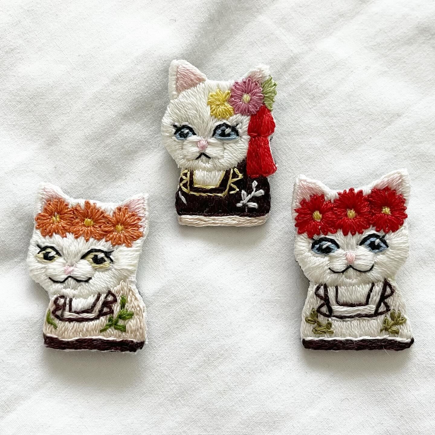 \ボタニカルな花冠猫手刺繍ブローチシリーズ/