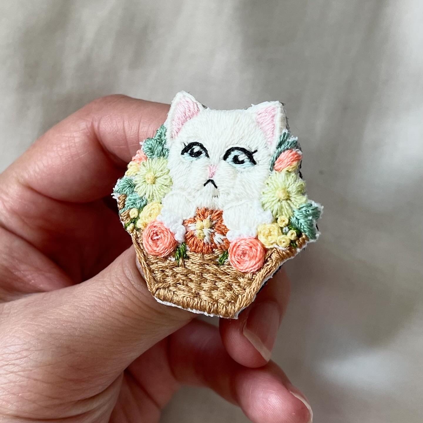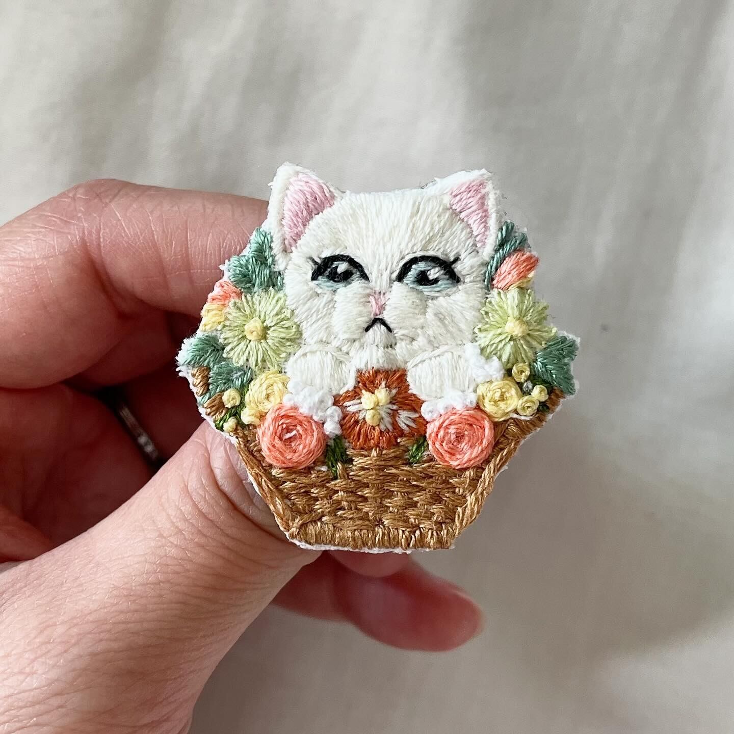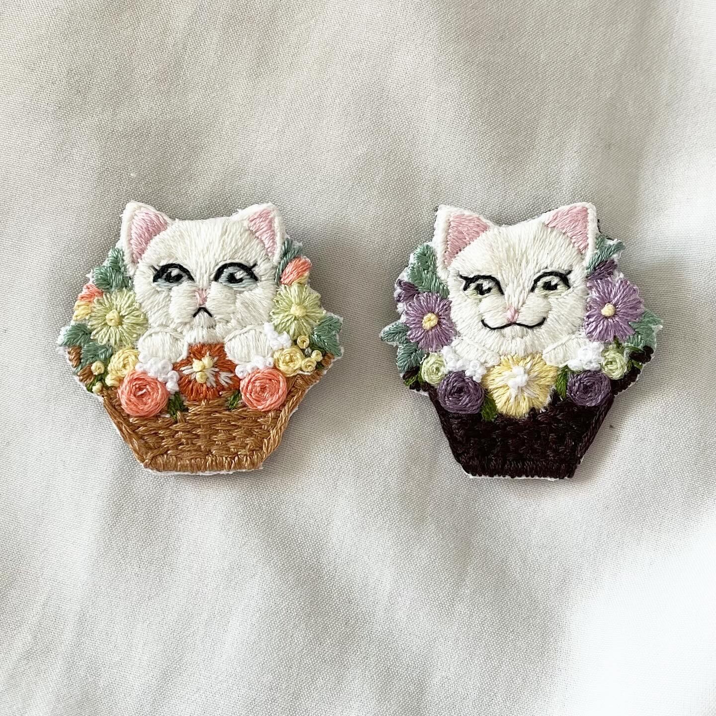 \花籠に入った猫ちゃん手刺繍ブローチシリーズ/