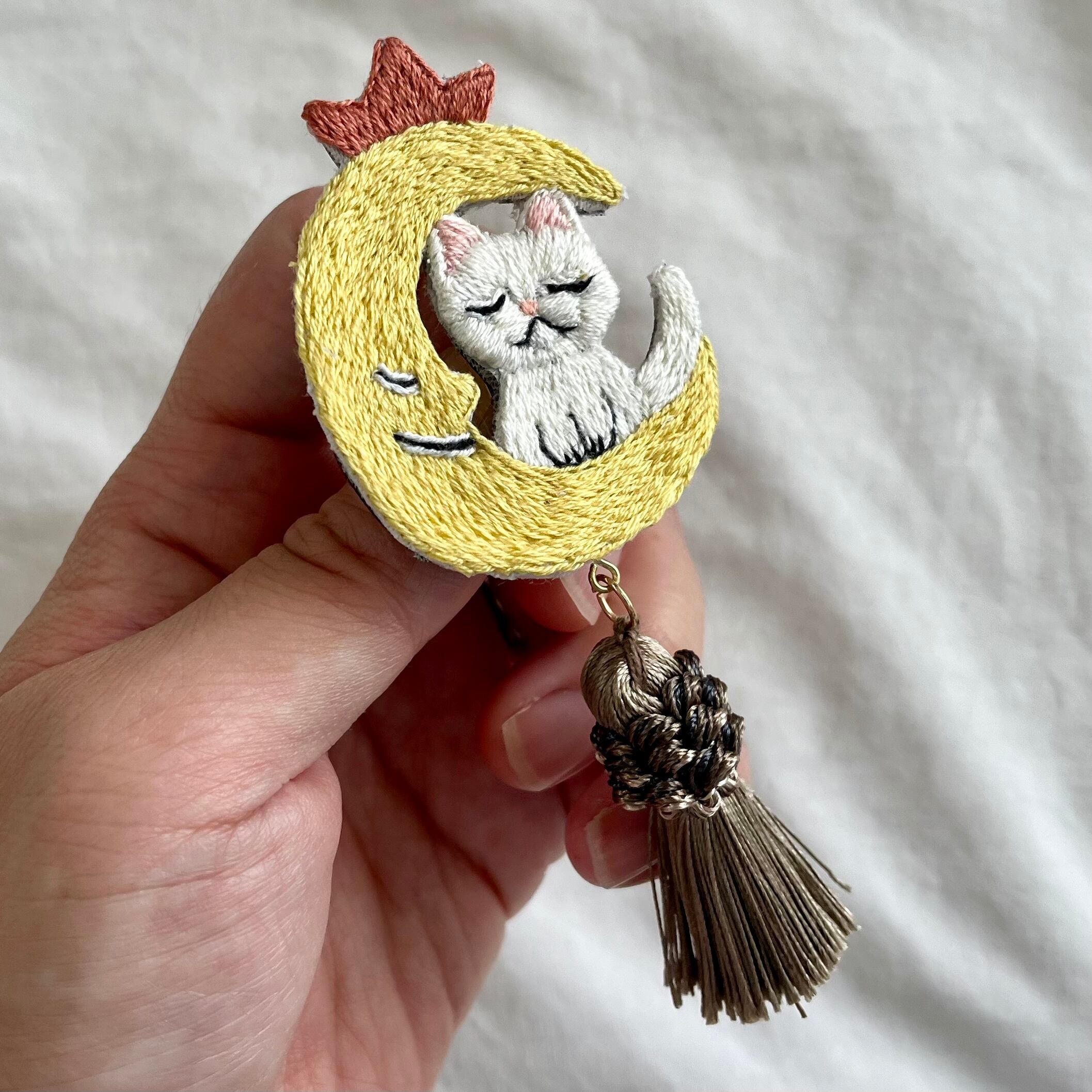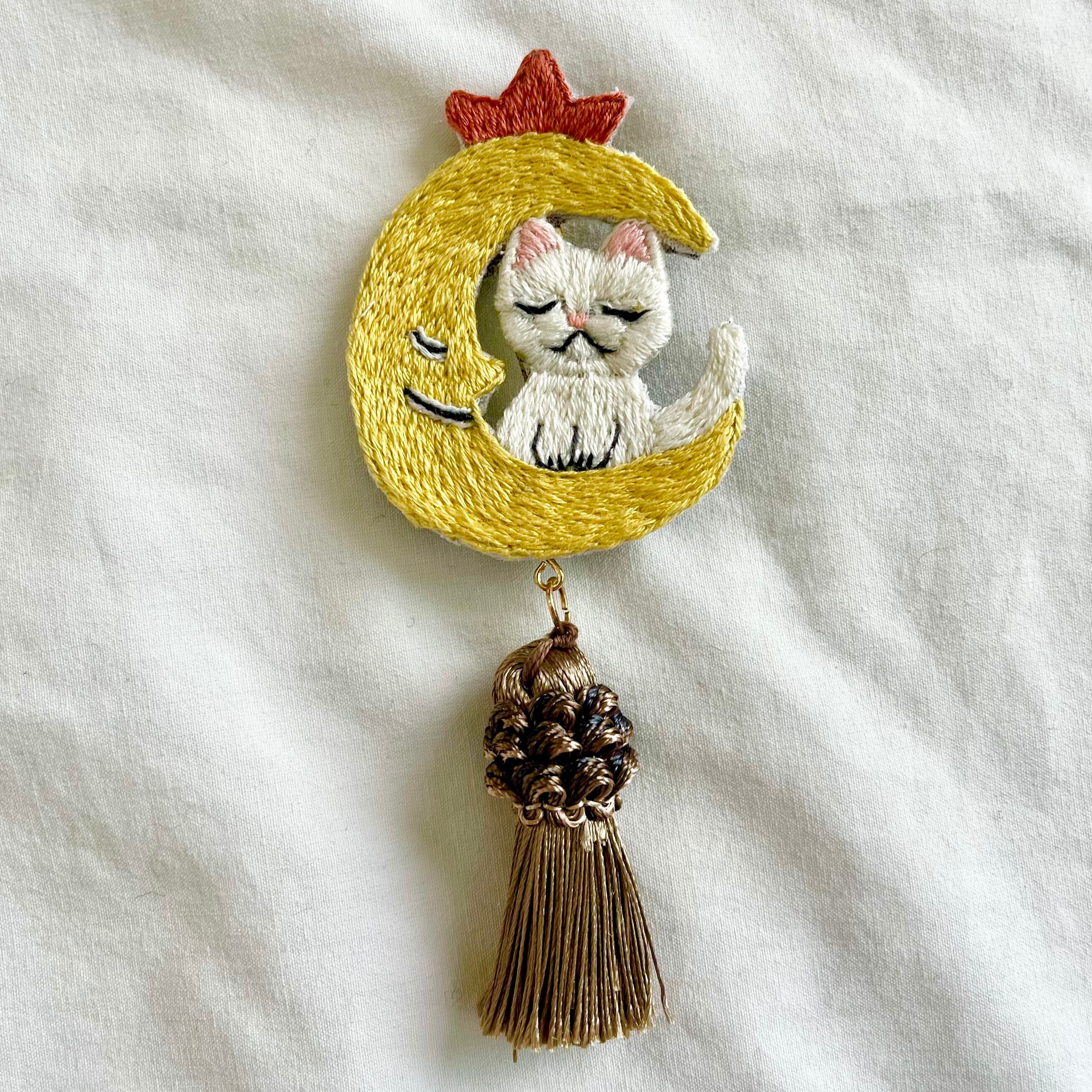 お月様と眠る猫 手刺繍ブローチ
