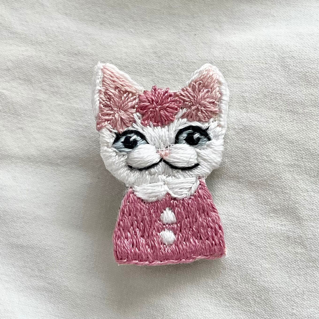 ボタニカルな猫ちゃん手刺繍ブローチ【白猫ピンク】