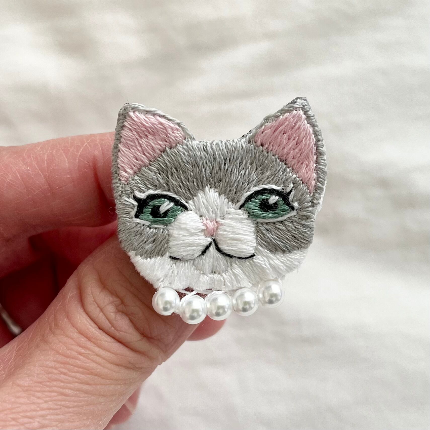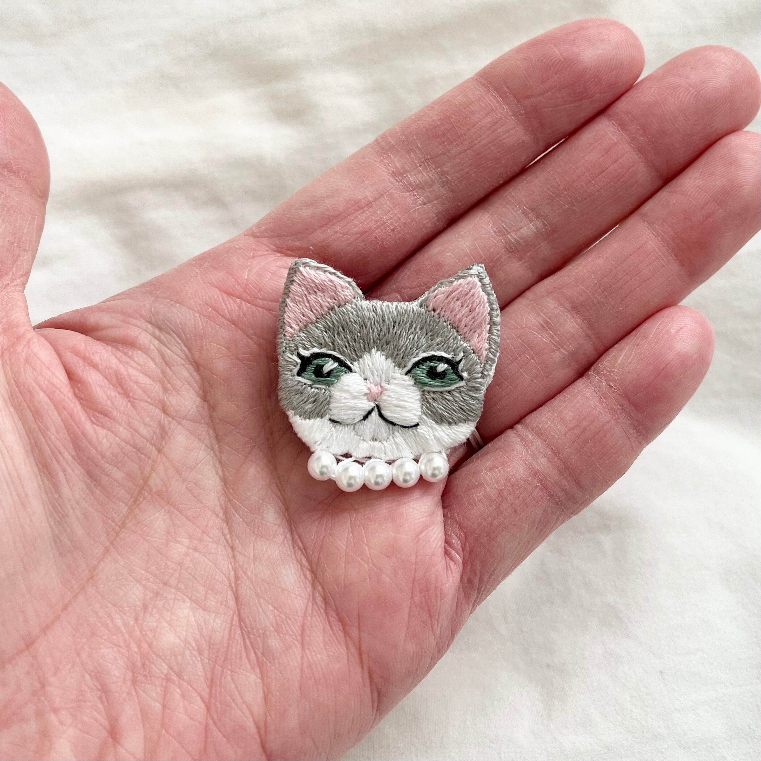 オシャレな猫ちゃん手刺繍ブローチ【グレーハチワレ】