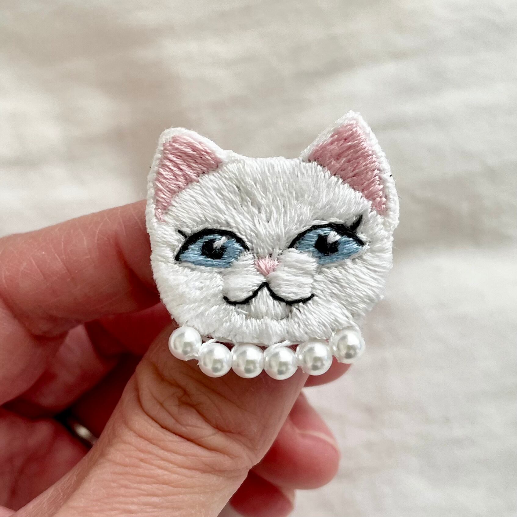 オシャレな猫ちゃん手刺繍ブローチ【白猫】