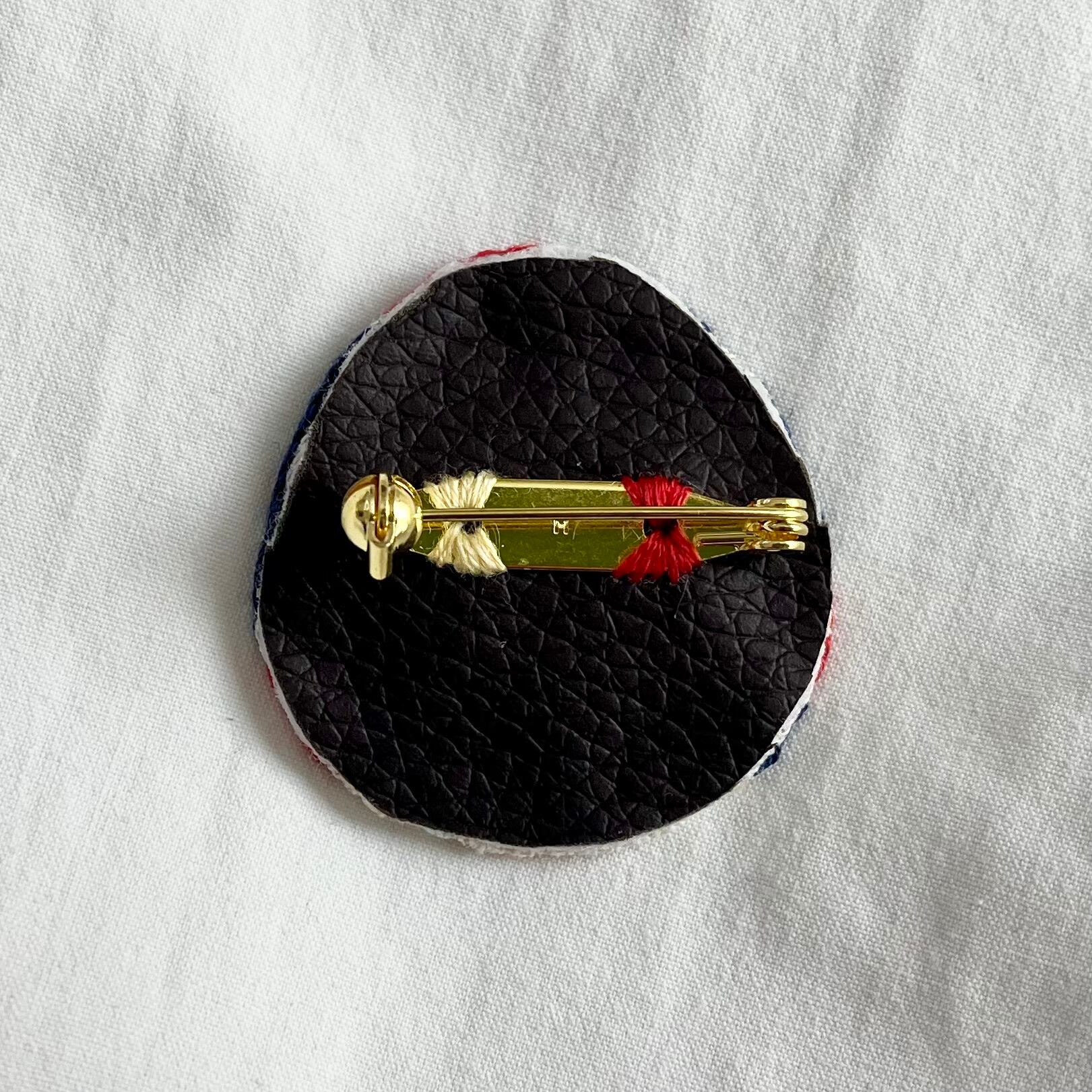 素材⋯COSMO刺繍糸、25mmブローチピン、裏面は接着芯とフェイクレザー生地を重ねています。